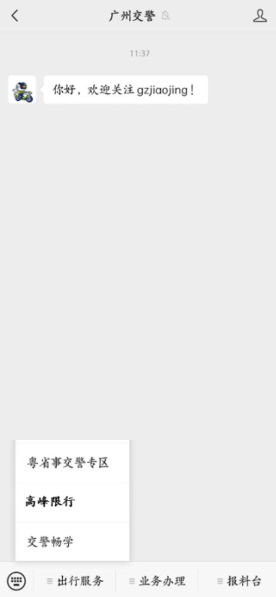 关注“广州交警”微信公众号,进入公众号,点击出行服务—高峰限行,进入页面。