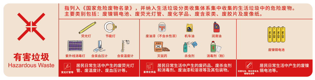 有害垃圾:会对人体健康或自然环境造成直接或潜在危害,分类投放后将交由专业的处置单位进行无害化处理。日常生活中常见的有害垃圾并不多,记住口诀:“汞灯药(汞、灯)池漆(池、漆)”。