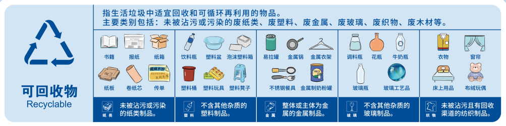 可回收物:是适宜回收、可循环利用的生活废弃物,可回收物的种类虽然不少,但也有方便记忆的口诀:“纸塑玻金衣”。