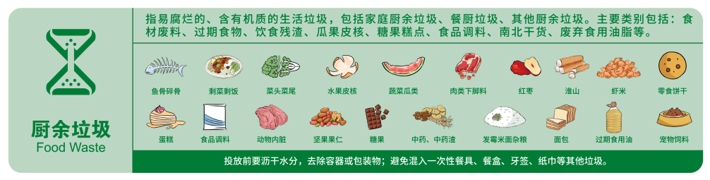 厨余垃圾:是指以有机质为主要成分,具有易腐烂发酵发臭等特点的生活垃圾。分类投放后,将交由专业的处置单位“堆肥”、发电、提取生产可用物质或无害化处理,绝大多数食物都是厨余垃圾。只要记住以下这些不是厨余垃圾就能准确分类:竹制品、大骨头、硬贝壳、椰子壳、榴莲壳、核桃壳、甘蔗皮、玉米衣、粽叶、硬果核等。