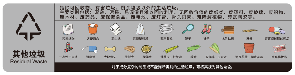 其他垃圾:指除有害垃圾、可回收物、厨余垃圾以外的其他生活废弃物,大多数家用卫生品以及复合型的。由多种材质、部件组成却难以拆解的产品,比如打火机、笔、伞等。