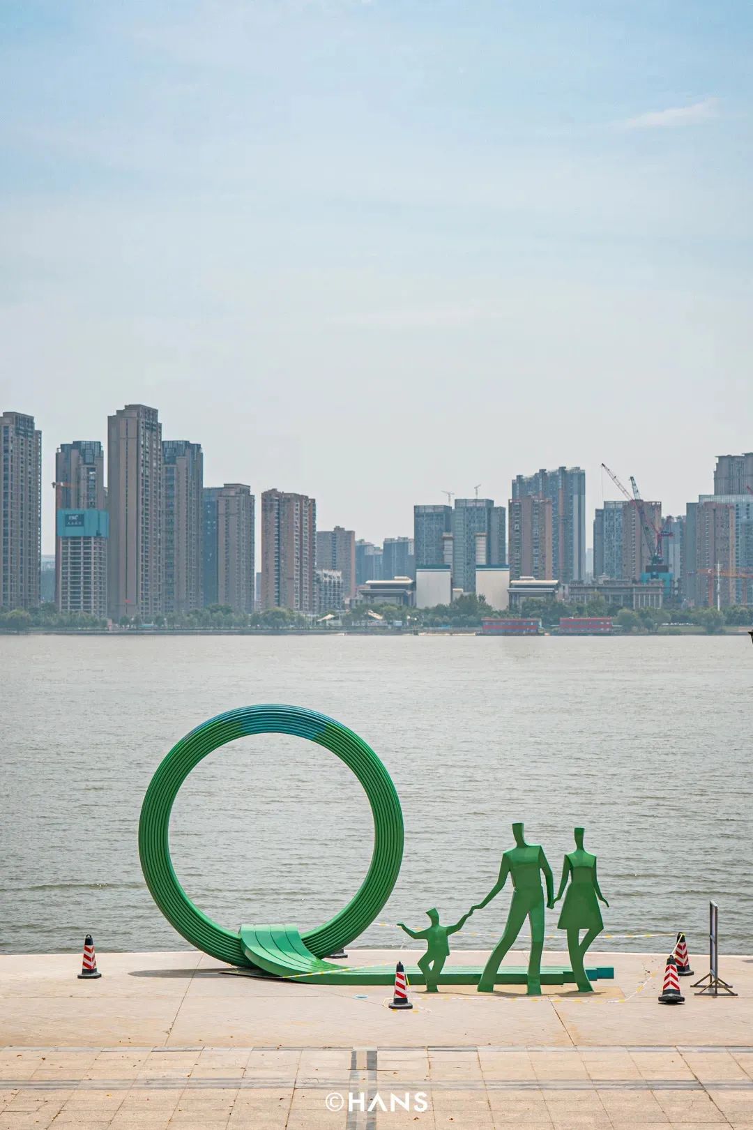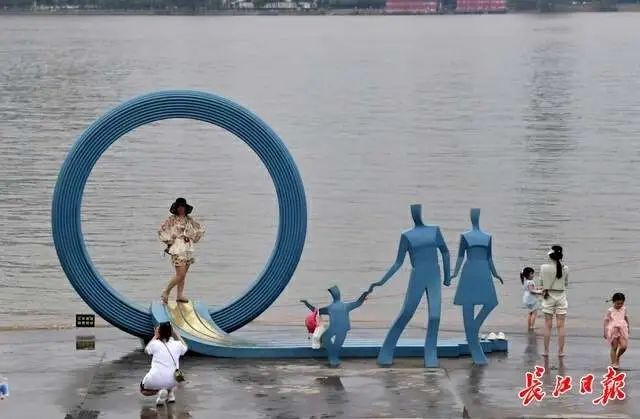 人人都爱跟“江滩一家人”合照互动。小孩子爬进环形圆圈,一脸神气,大人们则紧靠在“一家人”旁边,把包包顺手挎在小孩雕塑的胳膊上,就像亲戚来串门。雕塑背后,对岸是武汉最高的那栋楼,当时还未封顶,传说建成后会成为全国第一高楼。