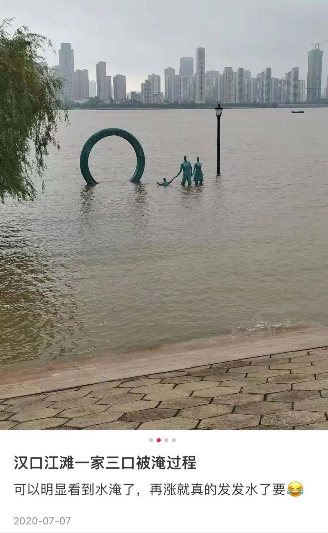 暂别。勿念。7月1日21时50分,汉口站水位升至27.30米,到达武汉防洪警戒水位。今天(7月2日)早上九点去江滩一看,哟嚯,武汉“江滩一家人”雕塑人物终于全部没入水下,水面上只留下一小截圆环。
