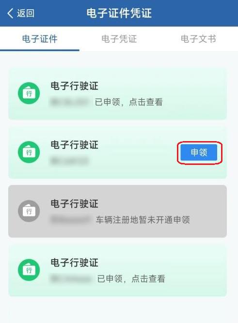 个人车辆申领个人用户登录“交管12123”APP,点击首页“电子证件凭证”功能,进入“电子证件”子功能。用户名下有机动车的,可点击电子行驶证右侧的【申领】按钮进行申领。