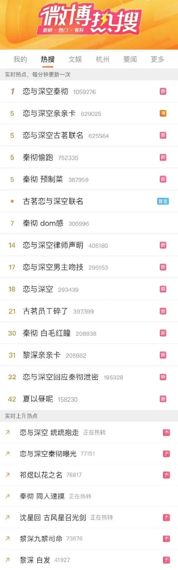 玩家整理的部分热搜,图源小红书@今天好像没睡好_自2024年1月18日正式上线以来,《恋与深空》为叠纸交出了一张绣满富贵花的答卷。