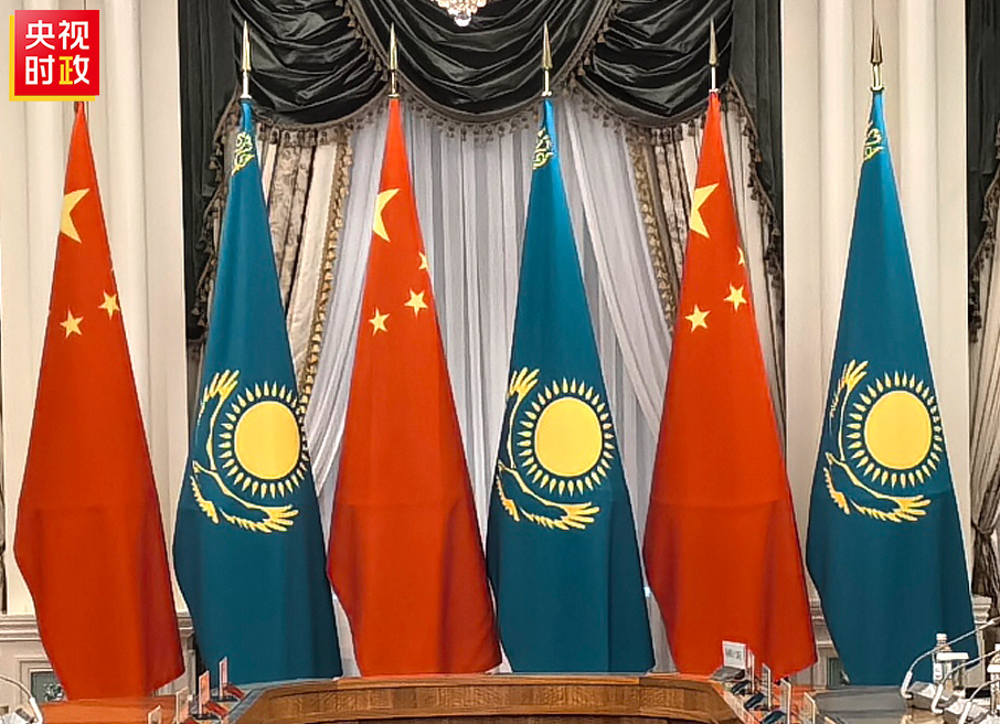 当地时间7月3日上午,国家主席习近平在阿斯塔纳总统府同托卡耶夫总统举行大范围会谈。