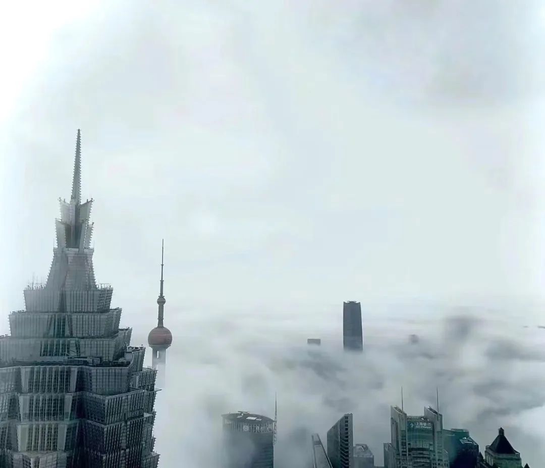 我们看到:一部分的上海坐落在大地上,一部分的上海折叠在云层里。