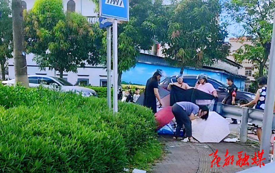 好几个热心的路人纷纷拿起雨伞为孕妇遮挡,齐心协力为医护人员迅速搭建起一个临时的“爱心产房”。