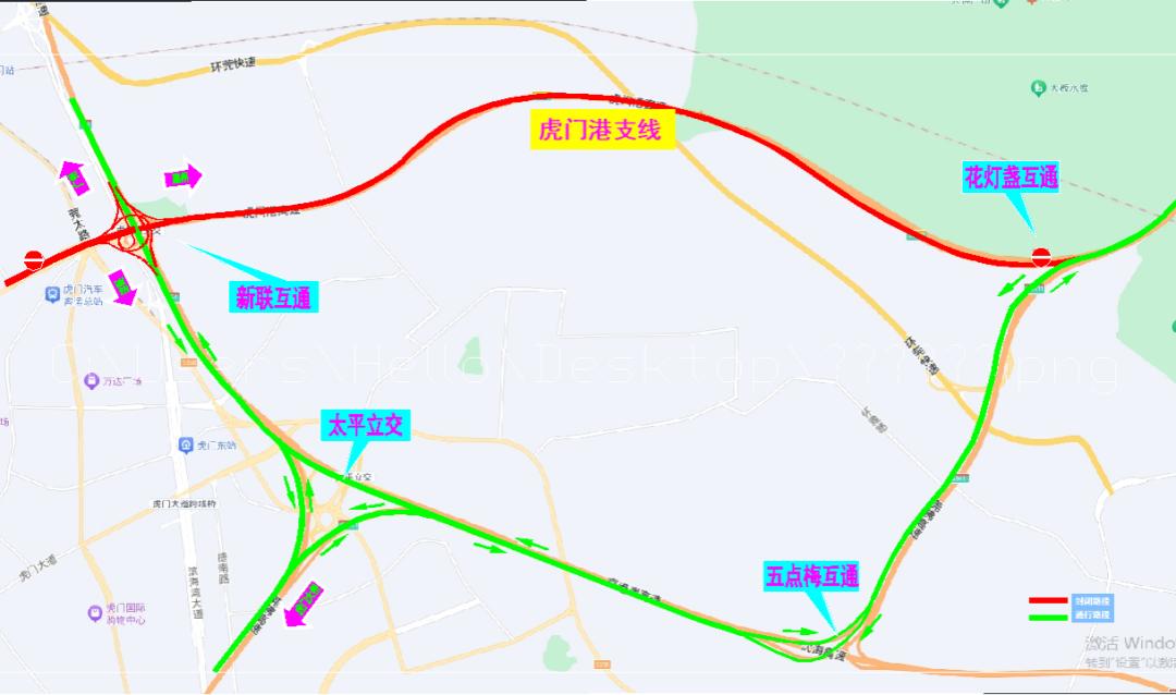 封闭区段自花灯盏互通起,跨越京港澳高速主线后,止于虎门北收费站。具体封闭口如下: