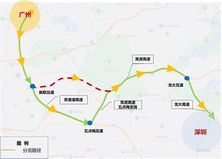 龙大高速—龙大互通—常虎高速主线—常虎五点梅支线—五点梅互通—京港澳高速—广州。