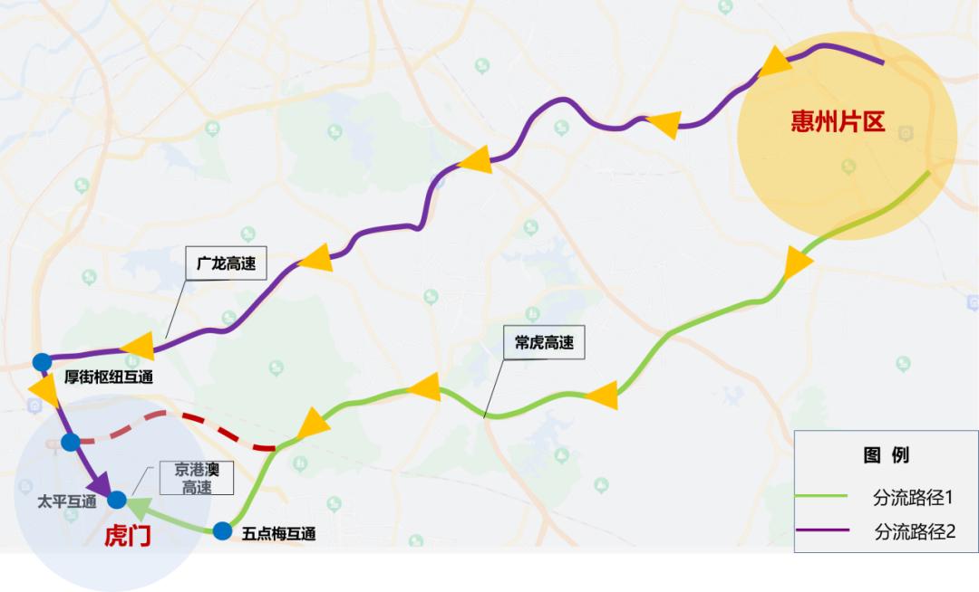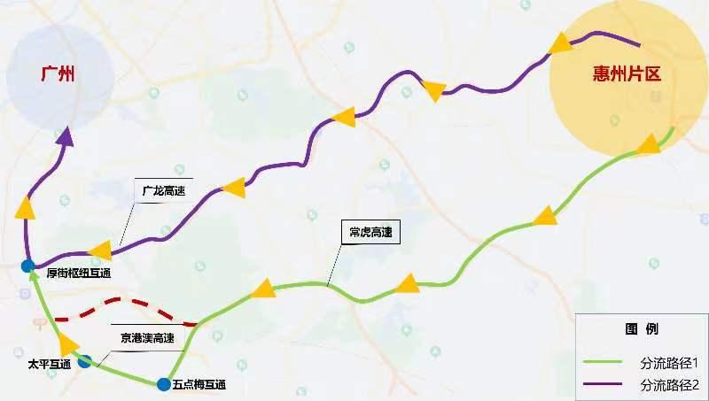 ①路径一:京港澳高速—五点梅互通—常虎高速五点梅支线—常虎高速—惠州;