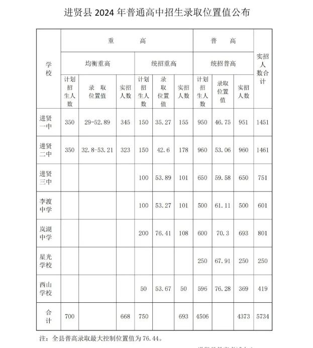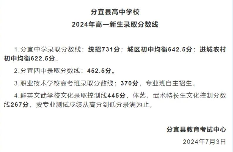 城区高中(樟树中学和滨江中学)统招录取线为724.5分,最低录取线为624分;