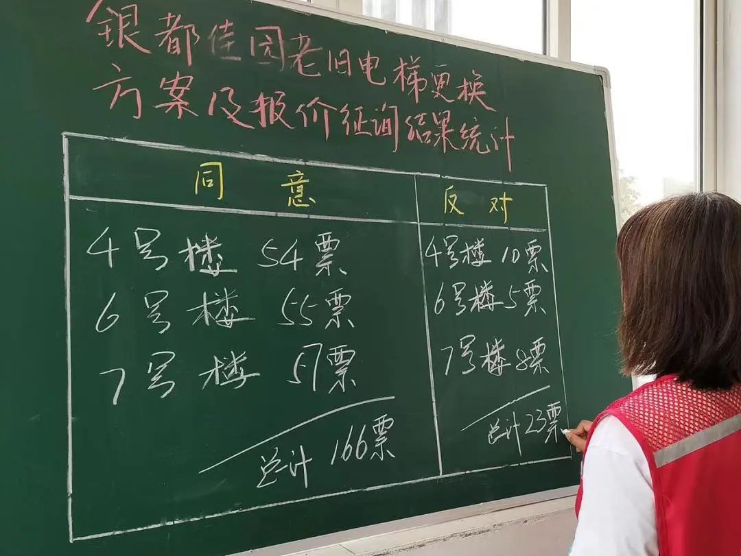 念好“细”字诀,让换梯公开透明换梯工作小组经过民主协商,决定通过“三方比价”选择电梯。在此基础上,换梯工作小组邀请三家电梯公司,根据小区特点制定详细的换梯方案,明确更换范围、更换时间和施工进度等。居民区第一时间通过线上楼组群、线下书面征询单广而告知,由居民自主选择换梯的单位,做到全过程公开透明。