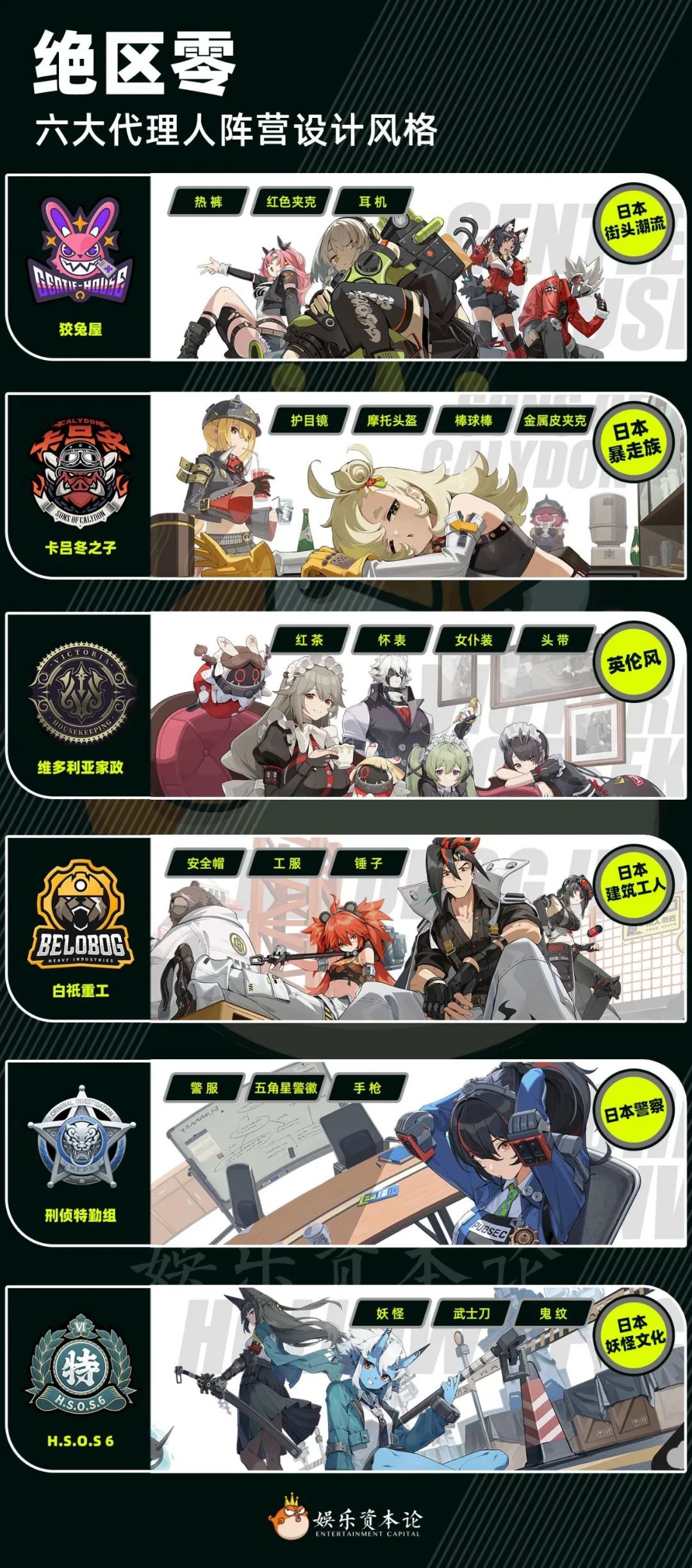 《绝区零》六大代理人阵营设计风格狡兔屋是由妮可创建的微型人力资源派遣商社,其主营业务是解决“空洞灾害”相关的任意委托。狡兔屋的四位代理人主打街头潮流风格。即便是比利·奇德这样的机器人,红色夹克和耳机也会令人想起专业的电音DJ。