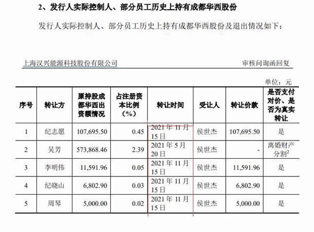 需要指出的是,在上述和解协议达成的背后,汉兴能源的实控人纪志愿、吴芳、李明伟以及副总经理纪晓山、周琴曾在成都华西持股,他们曾分别持有成都华西0.45%、2.39%、0.05%、0.03%、0.02%的股份。其中,吴芳持有的股份在其2021年5月20日离婚时分割给了侯世杰,而纪志愿、李明伟、纪晓山、周琴则均在2021年11月15日将所持成都华西股份转让给了侯世杰(见图二)。