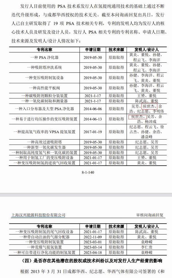汉兴能源强调:“目前使用的PSA技术系发行人在氢提纯通用技术的基础上通过不断迭代升级形成,与成都华西授权的技术无关。截至本问询函回复出具日,发行人已自主研发取得了19项PSA技术相关专利,专利的发明人均为发行人的核心技术人员、研发及设计人员。”