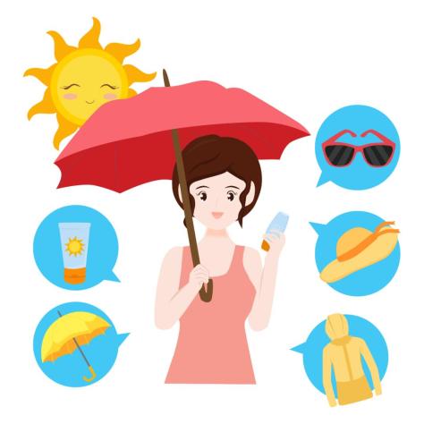 太阳紫外辐射较强时,尤其是皮肤敏感的人应采取紫外辐射防护措施,防止晒伤。太阳辐射的防护一般建议遵循“四戴原则”:“戴宽边太阳帽、戴太阳镜、穿戴长衣长裤及携带SPF大于等于15的防晒霜”。
