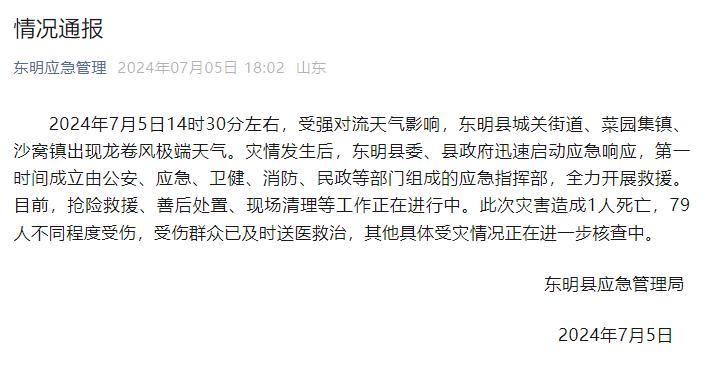 7月5日14时30分左右,受强对流天气影响,东明县城关街道、菜园集镇、沙窝镇出现龙卷风极端天气。灾情发生后,东明县委、县政府迅速启动应急响应,第一时间成立由公安、应急、卫健、消防、民政等部门组成的应急指挥部,全力开展救援。目前,抢险救援、善后处置、现场清理等工作正在进行中。此次灾害造成1人死亡,79人不同程度受伤,受伤群众已及时送医救治,其他具体受灾情况正在进一步核查中。此前报道: