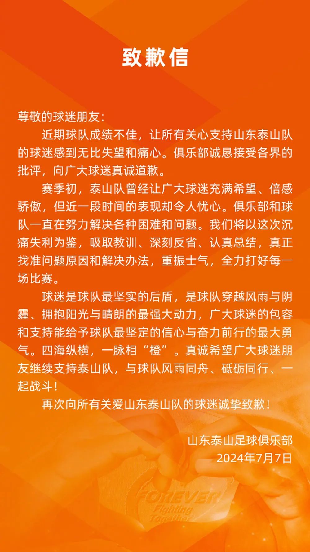 球迷是球队最坚实的后盾,是球队穿越风雨与阴霾、拥抱阳光与晴朗的最强大动力,广大球迷的包容和支持能给予球队最坚定的信心与奋力前行的最大勇气。四海纵横,一脉相“橙”。真诚希望广大球迷朋友继续支持泰山队,与球队风雨同舟、砥砺同行、一起战斗!再次向所有关爱山东泰山队的球迷诚挚致歉!