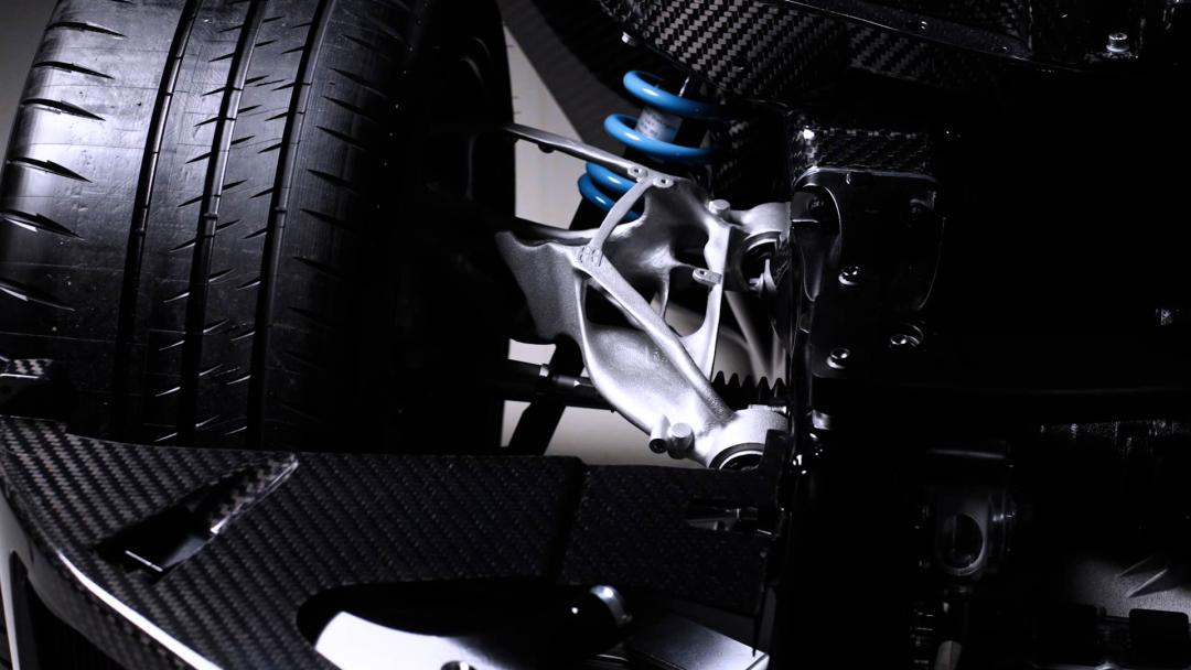 再就是一些变态到极致的机械设计了,就比如马特觉得这车就得和高端手表一样,就算看不见的地方也得是优雅好看的。于是在把所有覆盖件拿掉以后, Tourbillon 的内部结构是这样的。