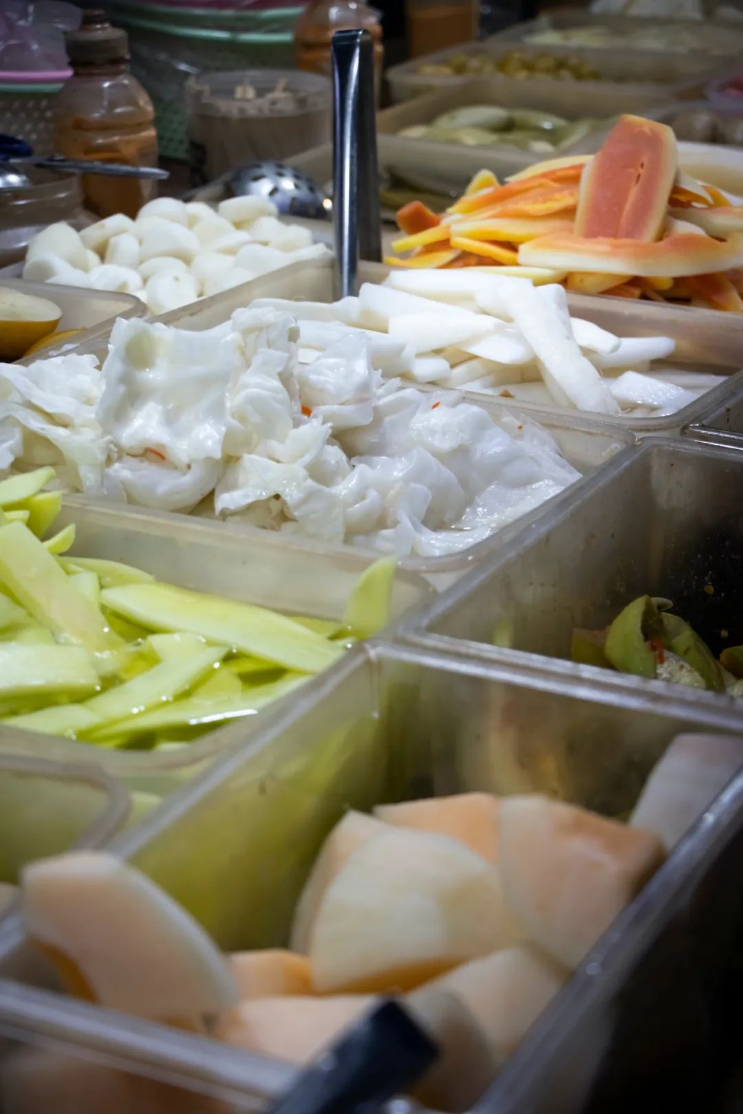 如果你来广西,会发现广西到处都有这样一类店铺。常常能见到这样的小吃车或者店铺,满满的玻璃缸排成一列,里面装着五颜六色、品种各异的瓜果蔬菜,玲琅满目,让人挑花了眼。