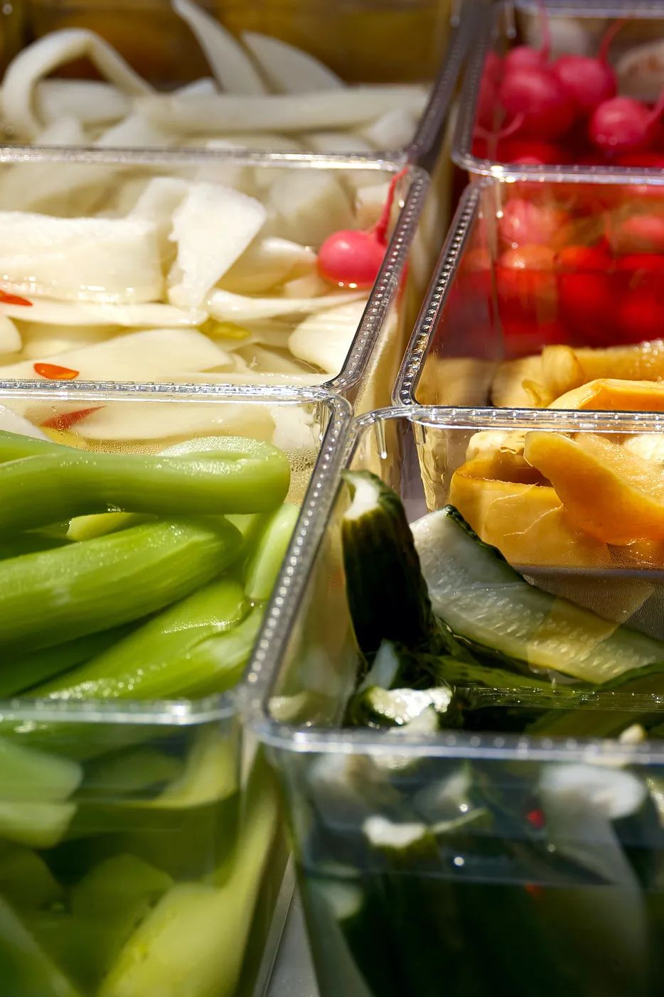 最常见的莫过于白萝卜、莴苣、包菜、黄瓜和莲藕,或切片或刨丝或切片,用盐简单腌制后杀去水分,保证食材的新鲜脆口,经过一段时间腌制后变得十分美味:萝卜的涩意和辣味尽消;莴苣仍留有蔬菜清新香气;莲藕脆爽,咬下一口还能拔出丝;包菜更是变得口感柔和……
