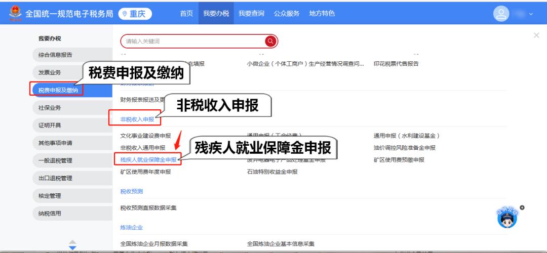 1.登录系统。打开重庆市电子税务局网站,选择“企业业务”登录系统,依次点击【我要办税】-【税费申报及缴纳】-【非税收入申报】-【残疾人就业保障金申报】,进入功能页面。