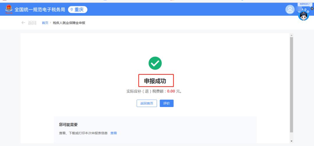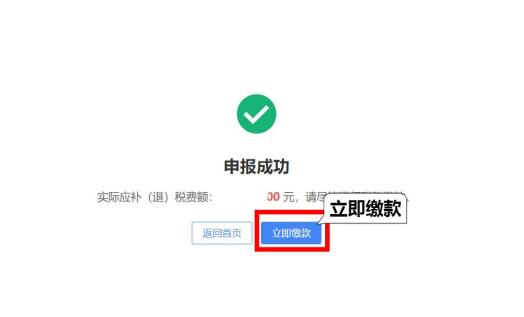 3.缴款。申报成功后,如果单位需要缴纳残保金,可点击【立即缴款】进行费款缴纳。如果系统显示“实际应补(退)税费额:0.00元”,则无需缴纳费款。