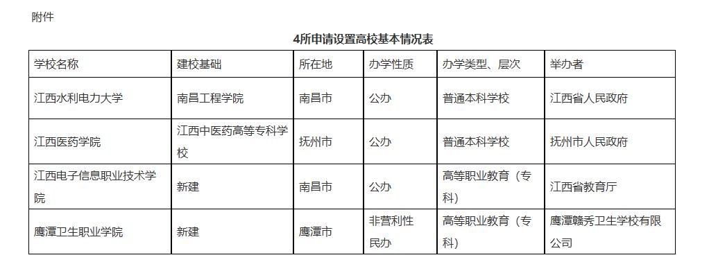 7月8日,江西省教育厅官网发布《关于高等学校设置事项的公示》。根据《中华人民共和国高等教育法》《普通高等学校设置暂行条例》《普通本科学校设置暂行规定》《高等职业学校设置标准(暂行)》等有关规定,经第四届江西省高校设置评议委员会专家考察和评议,南昌工程学院更名江西水利电力大学(公办)、以江西中医药高等专科学校为基础设立江西医药学院(公办),设置江西电子信息职业技术学院(公办)、设置鹰潭卫生职业学院(非营利性民办)获得通过,现将学校相关信息向社会公示。