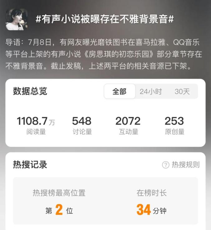7月8日,有网友曝光磨铁图书在喜马拉雅、QQ音乐等平台上架的有声小说《房思琪的初恋乐园》部分章节存在不雅背景音。此消息引发网友广泛关注,冲上热搜第二。