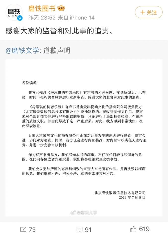 7月8日晚,磨铁文学就《房思琪的初恋乐园》有声书的相关问题发布《道歉声明》,表示已第一时间下架相关音频并进行重新审查。磨铁图书称,《房思琪的初恋乐园》有声书是由天津悦响文化传播有限公司接受我方(北京磨铁数盟信息技术有限公司)委托制作的。在收到制作文件后,我方未对全部音频文件进行严格细致的审核,只是进行了局部抽查检验,存在严重的质检失职,并由此导致了这一严重后果。对此,我方感到非常愧疚,在此深表歉意。