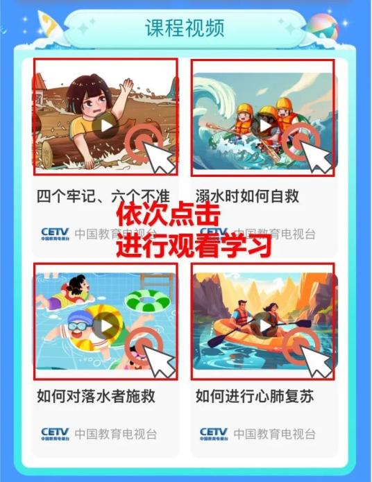 中国教育电视台开展“暑假安全第一课——珍爱生命严防溺水”公益课程活动,倡议各地各校动员各中小学教职员工、学生及家长届时收看。