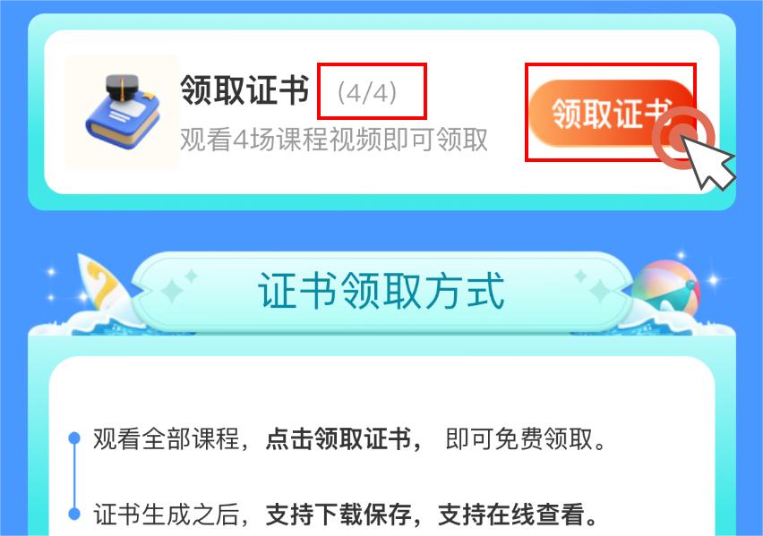 ④完成4场课程视频学习,点击领取证书