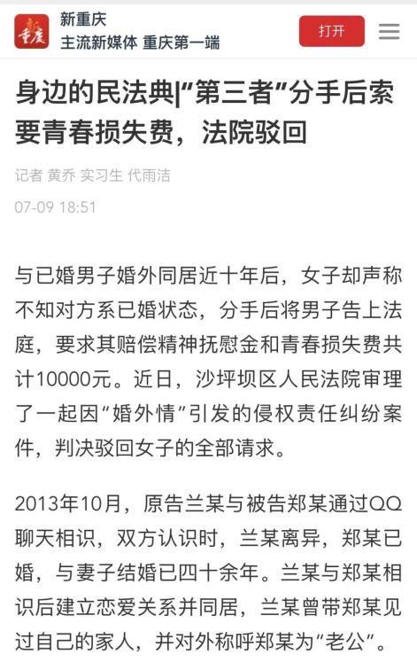 原标题:《“第三者”分手后索要青春损失费,法院驳回,婚外同居关系不受法律保护》