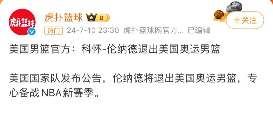 7月10日,据报道,科怀·伦纳德(Kawhi Leonard)将退出美国奥运男篮,专心备战NBA新赛季。