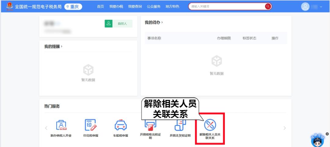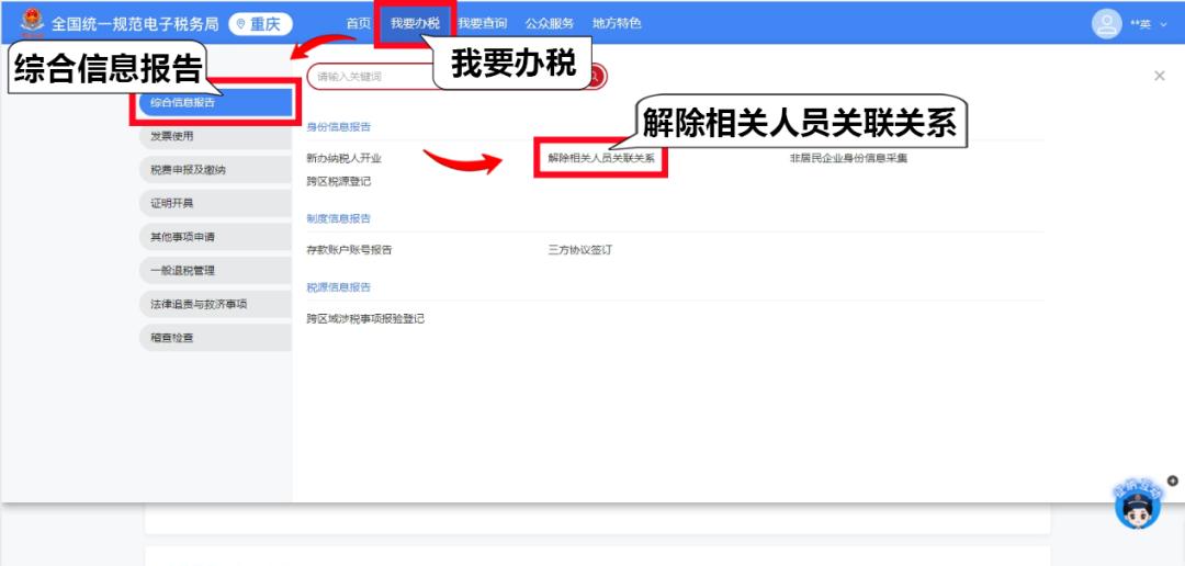 1.以自然人身份登录电子税务局,点击首页“热门服务”板块的【解除相关人员关联关系】,或者依次点击【我要办税】-【综合信息报告】-【解除相关人员关联关系】。