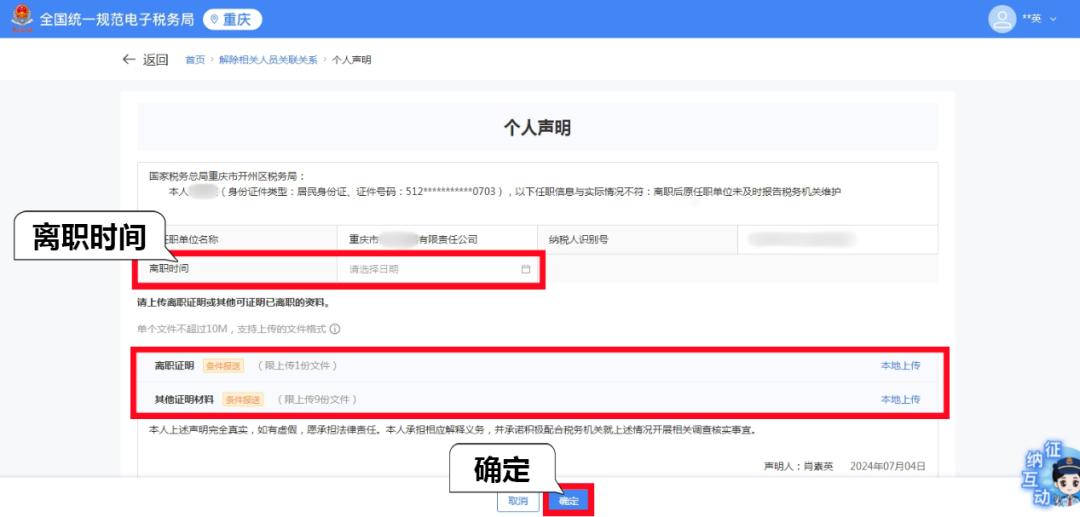 >>>4.在“个人声明”界面填写【离职时间】,上传“离职证明”或“其他证明材料”,点击【确定】,提交申请。