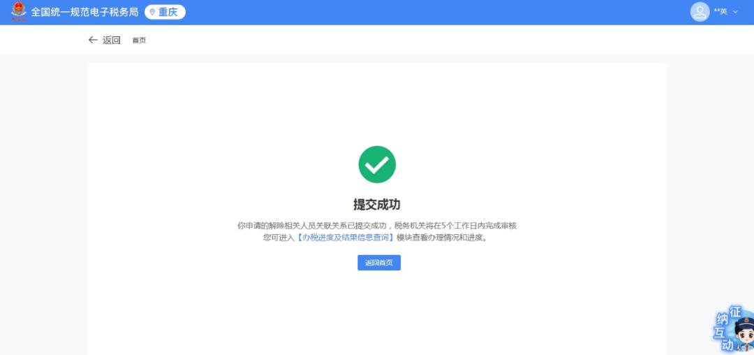 >>>5.提交成功后,税务机关将在5个工作日内完成审核,耐心等待即可。您可以在“办税进度及结果信息查询”模块查看办理情况和进度。