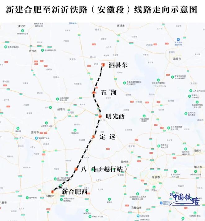 合新高铁起自安徽省合肥市,途经定远县、凤阳县、明光市、五河县、泗县,以及江苏省泗洪县、宿迁市市区,终至新沂市,线路全长约324公里,设计时速350公里。
