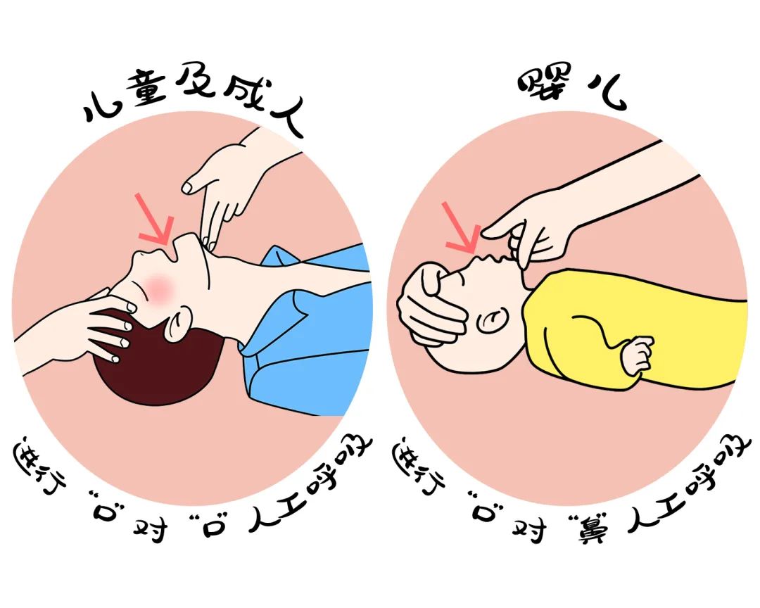 人工通气2次(儿童及成人进行口对口人工呼吸,婴儿可进行口对鼻人工呼吸)3-5是、秒给予一次通气