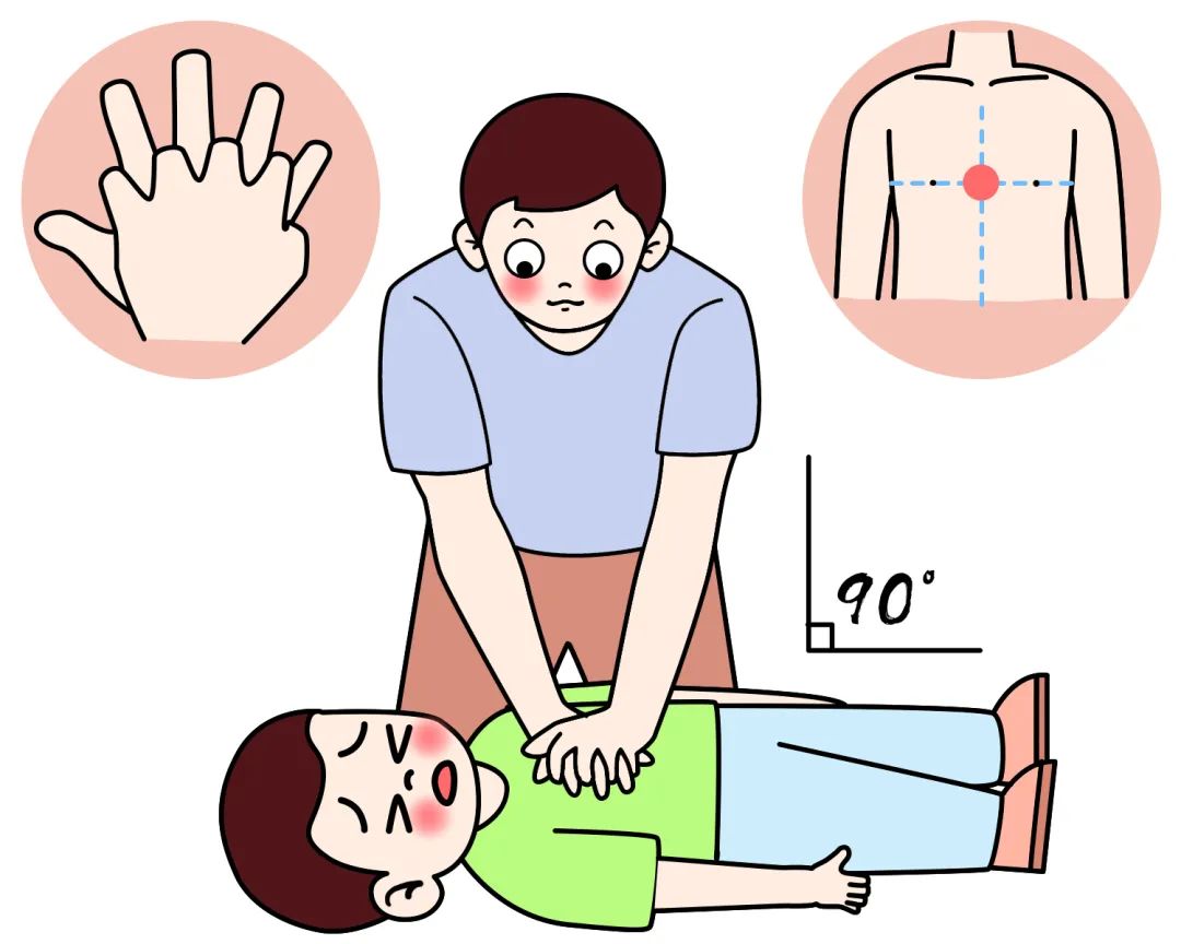 按压位置应该是成人在胸骨中下段1/3,两个乳头连线的中点,或者是剑突上两横指。按压的方式是将一只手的掌根位于另只手的掌根之上,手指不能触碰胸壁。按压时需双肘伸直,用力垂直下压,频率为100次/分。对于儿童患者,用单手或者双手于乳头连线水平按压胸骨。对于婴儿患者,用两手指于紧贴乳头连线下方水平按压胸骨。按压频率:100-120次/分钟,30次按压/2次通气,按压中断时间小于10秒