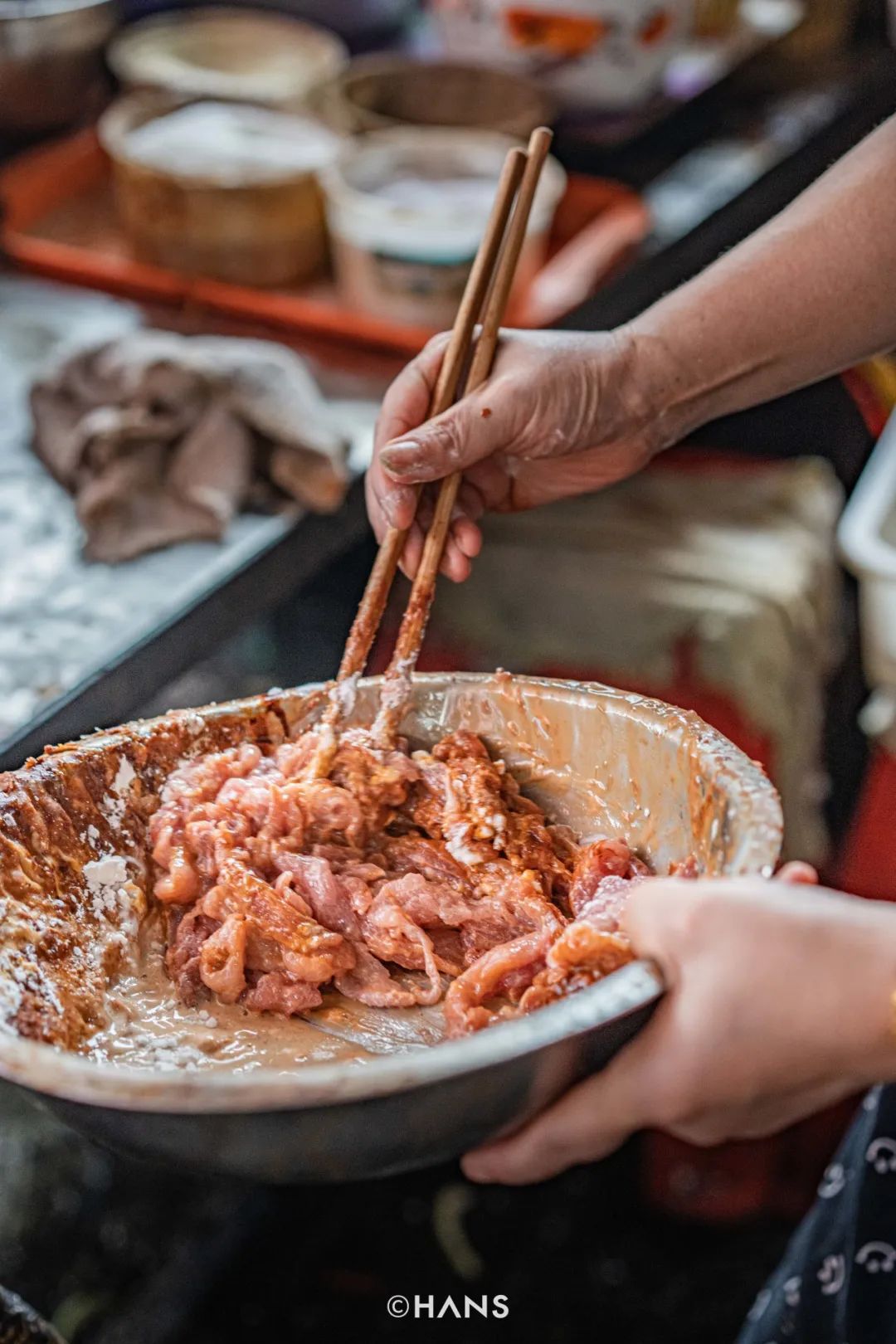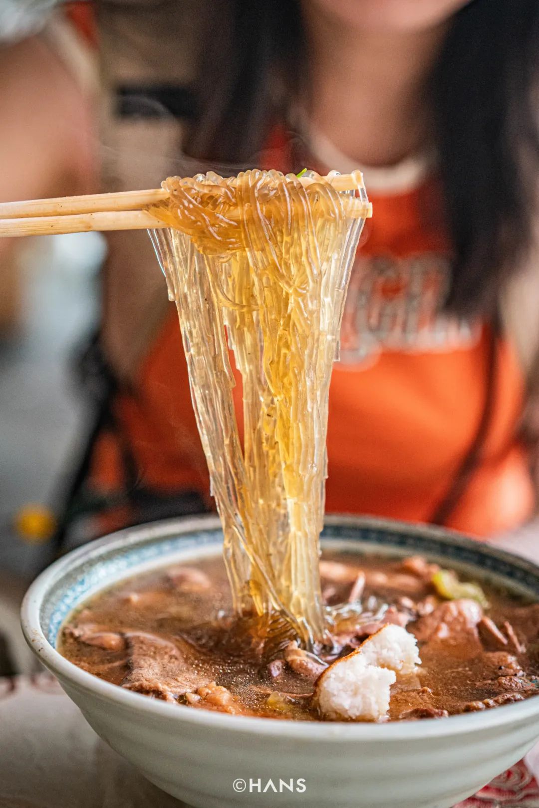 现切的新鲜内脏在不锈钢大盆里反着精光,要下锅几碗老板就码几碗的料,肉上面裹着生粉生抽。锅里的猪骨高汤翻滚就下肉,肉在汤里滚,既要汆熟,又不能太老,掌勺的女师傅把控着火候,两分钟之内必须起锅了。等待过程中,我联想到两个熟悉的食物。一个是武汉人常吃的牛肉生烫,类比一下,这个似乎可以理解为猪肉生烫?另外一个是好多学校门口会做的瘦肉猪肝粉丝煲,一般粉丝煲里面很少有腰花,毕竟腰花需要更精细的处理。