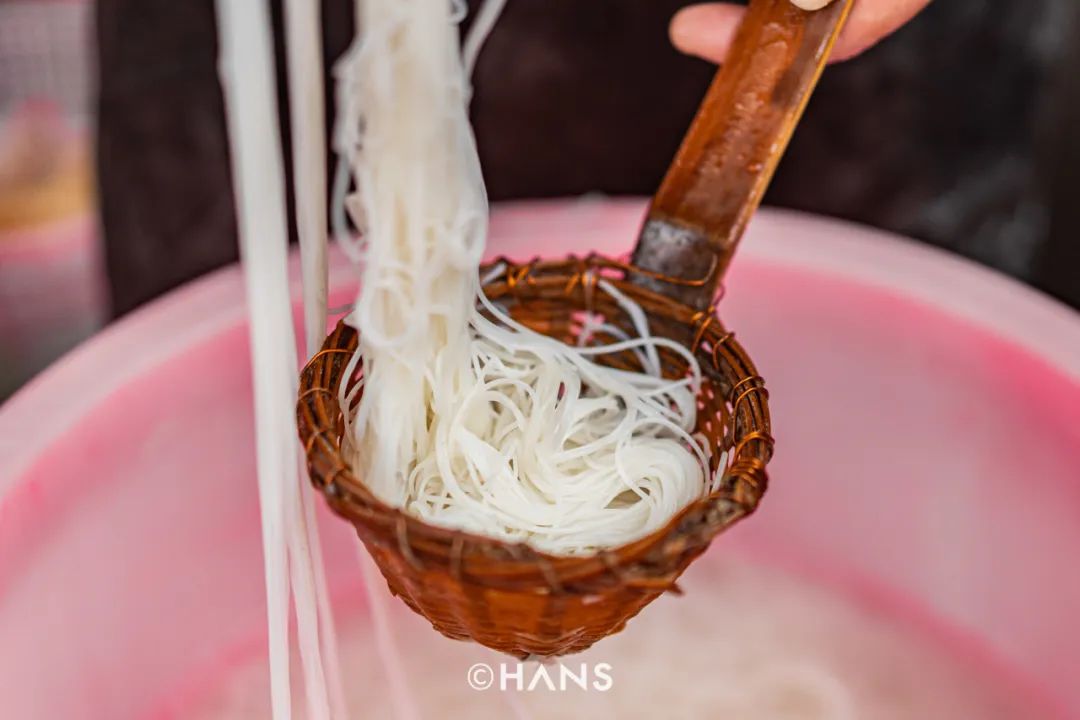汉川版糊汤粉用的黄潭米粉比武汉版糊汤粉更细,可以说比一根银针粗不了多少。细若游丝的米粉,每一根都吸饱了汤汁,咸香鞭辟入里。不过,搭的也是油条。汉川同事侃侃在武汉工作多年,最怀念的就是汉川的糊汤粉。武汉的粉他觉得没有汉川的细腻,个别店家用鲫鱼熬的汤,带有腥味,而且汤汁过分浓稠,“有点糊嘴巴”。在侃侃小时候,他还在汉川吃过用猪大骨熬制的糊汤粉,那种微稠的骨头汤简单配上胡椒与香葱,就让人能记很久。