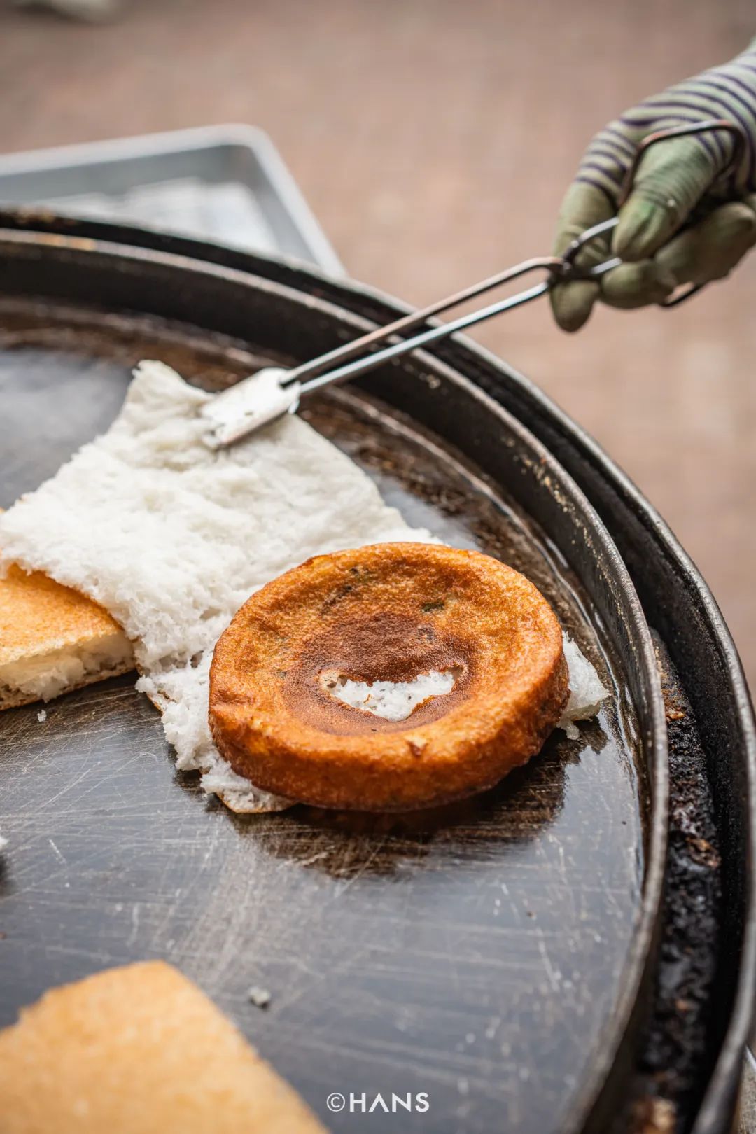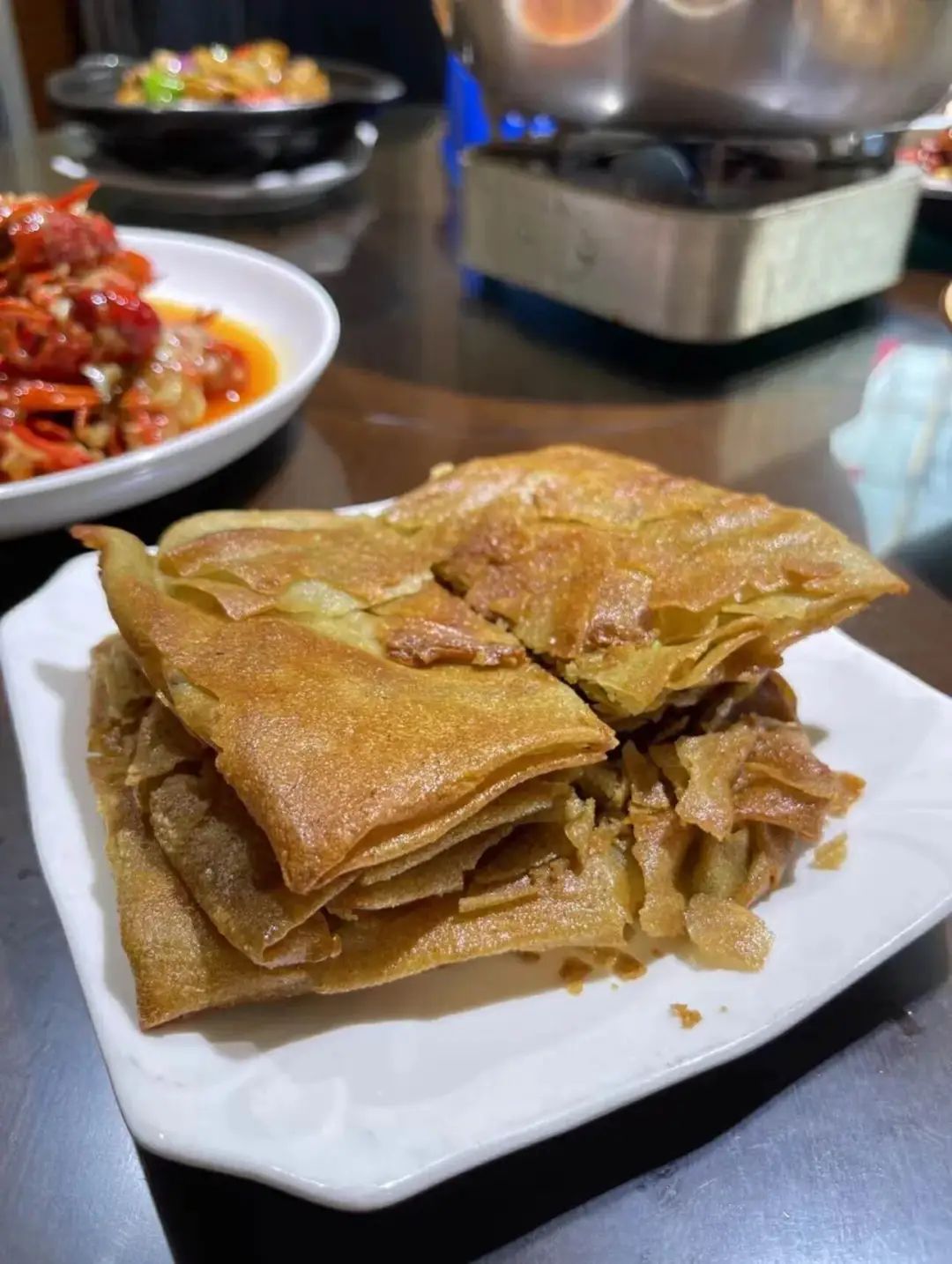 马口豆皮不像武汉三鲜豆皮,反而更像是黄陂的炕豆丝,大片豆皮炕至金黄,里面夹着粉条。不一样的豆皮,同样的碳水快乐。马口烧烤宵夜很出名,所以这个马口豆皮不仅是汉川人的过早选择,也是人们宵夜桌上小酌的配菜呢。