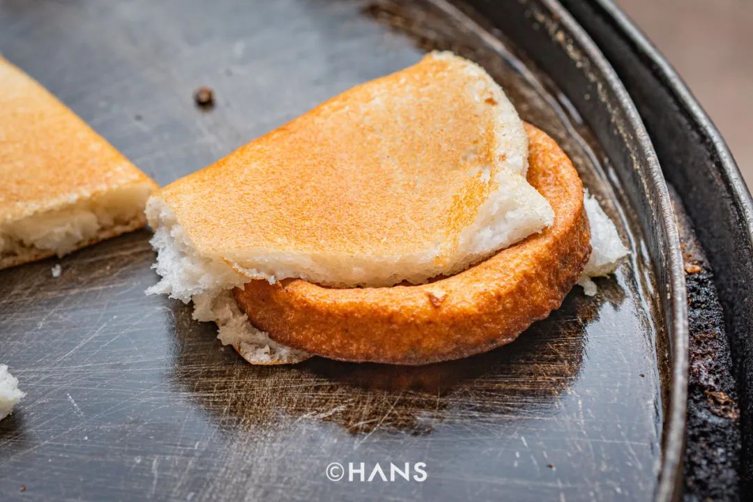 我在当地福星城菜市场还发现了汉川人民的巧思:米耙夹面窝。在网上还有点红的咧,和武汉早期的糯米包油条、面窝夹烧梅那个味儿,再次呼应上了。米粑在武汉也有,一般要去老菜场才能买到,但是在汉川依然非常普遍。别说,米粑这大个头倒还真的挺适合搞组合搭配,加上口感绵柔,带着酒香,和炸得枯枯的面窝一起,口感丰富。