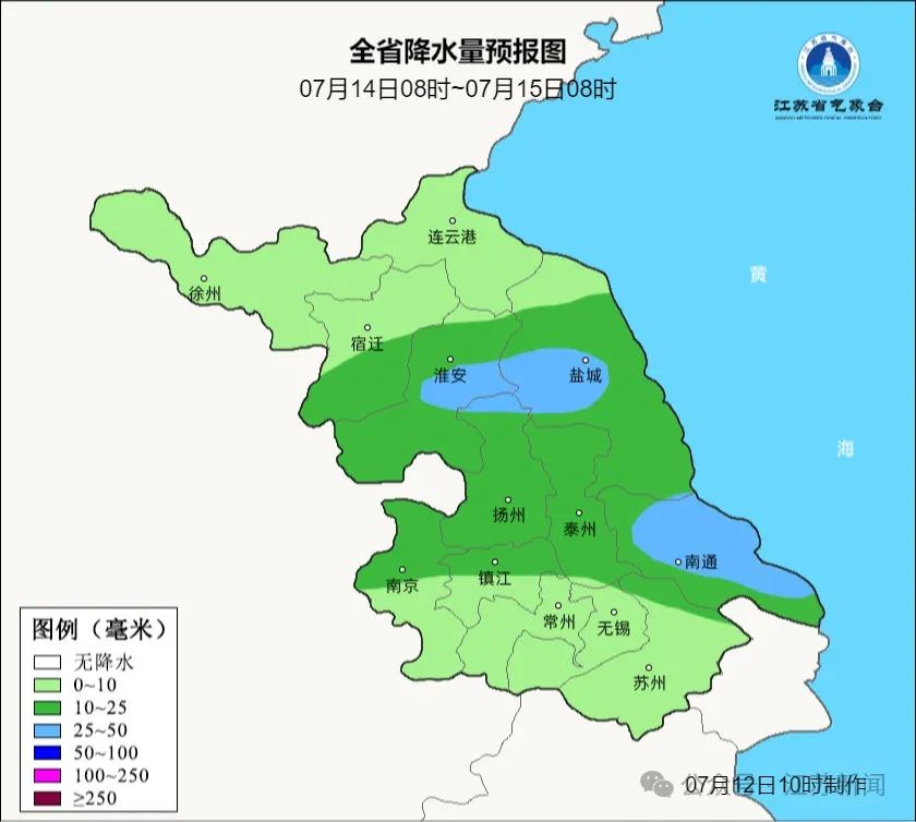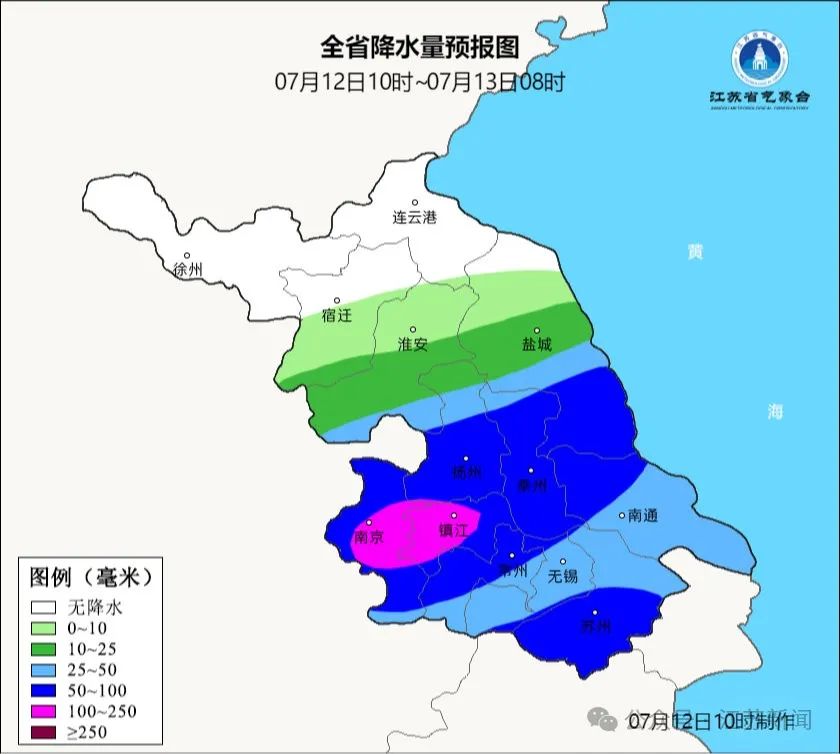 江苏省气象台2024年07月12日09时50分变更发布暴雨蓝色预警:预计今天白天到夜里,南京、镇江、扬州中南部、泰州、盐城南部、南通北部、常州、无锡、苏州等地的大部分地区将出现50毫米以上的强降雨,其中南京中北部、镇江、扬州南部等地的局部地区雨量可达100~150毫米,强降雨期间部分地区可能伴有小时雨量30~60毫米的短时强降水和8级左右的雷暴大风等强对流天气。