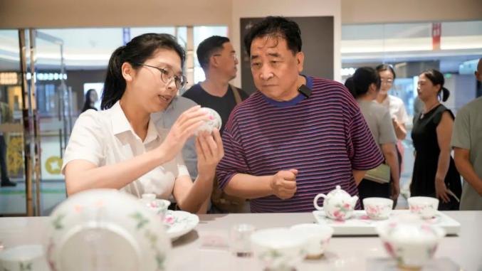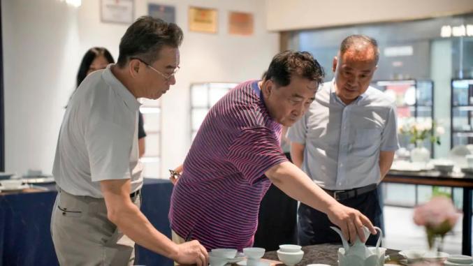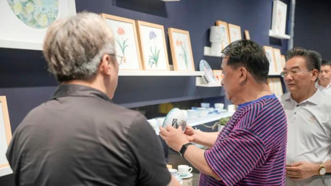姜昆一行先后前往二、三、四楼饶玉陶瓷、吉州窑、钧瓷缘、徐窑、奥司屯庄园、龙珠阁等景德镇本地品牌、国内外品牌、艺术瓷、酒店用瓷区参观。在参观过程中,姜昆一行详细了解了陶瓷的制作过程,并对匠人们精湛的手艺表示赞赏。随后,姜昆与部分品牌主理人、艺术家展开交流,并在现场与艺术家、游客进行互动拍照、签名留念。姜昆