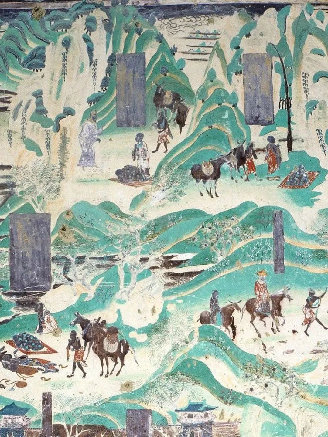 再如盛世大唐,则以黄金磨成粉末装饰到壁画上,一派富丽辉煌之色,由此可一窥独属于唐人的自信。