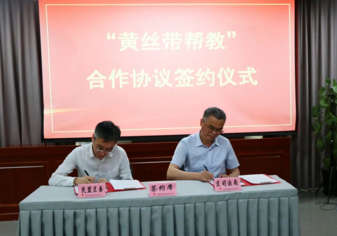 为贯彻落实民盟中央、司法部以及民盟市委、市司法局关于“黄丝带帮教”工作部署,7月12日上午,民盟杨浦区委和杨浦区司法局举行“黄丝带帮教”签约启动仪式。区委常委、统战部部长董鑫旺出席并讲话,区委统战部副部长陈敏,市司法局安置帮教处副处长杨挺,民盟市委志愿者服务总队常务副总队长范文成,民盟区委主委、区科协常务副主席钱彬,区司法局党委书记、局长邓远见,民盟区委副主委、区政协教科卫体专委会主任卢瑜出席。区司法局副局长何天玲主持签约仪式。