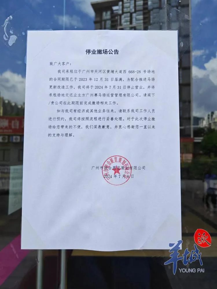 7月12日,羊城晚报全媒体记者走访赛马场内的马会家居发现,卖场的多个出入口玻璃门上已经张贴着“停业撤场”公告。公告显示:马会家居运营方广州市骏合展览策划有限公司表示,其承租的黄埔大道西668-28号场地已于2023年12月31日届满,为配合推进马场更新改造工作,公司将于2024年7月31日停止营业,并将场地交还给业主方广州赛马场运营管理有限公司,商户须在此期限前完成撤场相关工作。